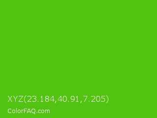 XYZ 23.184,40.91,7.205 Color is a normal green color and the nearest color is Kelly Green #4cbb17. Hex code #53c311 and RGB value is rgb(83,195,17). In RGB color space, this color is composed of 33% red, 76% green, 7% blue, In CMYK color space, this color is composed of 57% cyan, 0% magenta, 91% yellow , 24% black , In HSL color space, this color has a hue angle of 98° , 84% saturation and 42% lightness.