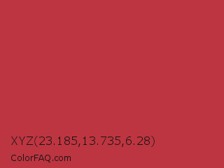 XYZ 23.185,13.735,6.28 Color is a normal red color and the nearest color is Brick Red #c62d42. Hex code #bd3540 and RGB value is rgb(189,53,64). In RGB color space, this color is composed of 74% red, 21% green, 25% blue, In CMYK color space, this color is composed of 0% cyan, 72% magenta, 66% yellow , 26% black , In HSL color space, this color has a hue angle of 355° , 56% saturation and 47% lightness.