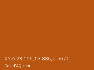 XYZ 23.196,16.886,2.567 Color is a normal orange color and the nearest color is Fiery Orange #b35213. Hex code #b85611 and RGB value is rgb(184,86,17). In RGB color space, this color is composed of 72% red, 34% green, 7% blue, In CMYK color space, this color is composed of 0% cyan, 53% magenta, 91% yellow , 28% black , In HSL color space, this color has a hue angle of 25° , 83% saturation and 39% lightness.