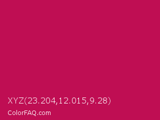 XYZ 23.204,12.015,9.28 Color is a normal rose color and the nearest color is Pictorial Carmine #c30b4e. Hex code #bf0e53 and RGB value is rgb(191,14,83). In RGB color space, this color is composed of 75% red, 5% green, 33% blue, In CMYK color space, this color is composed of 0% cyan, 93% magenta, 57% yellow , 25% black , In HSL color space, this color has a hue angle of 337° , 86% saturation and 40% lightness.