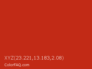 XYZ 23.221,13.183,2.08 Color is a normal red color and the nearest color is Thunderbird #c02b18. Hex code #c22a16 and RGB value is rgb(194,42,22). In RGB color space, this color is composed of 76% red, 16% green, 9% blue, In CMYK color space, this color is composed of 0% cyan, 78% magenta, 89% yellow , 24% black , In HSL color space, this color has a hue angle of 7° , 80% saturation and 42% lightness.