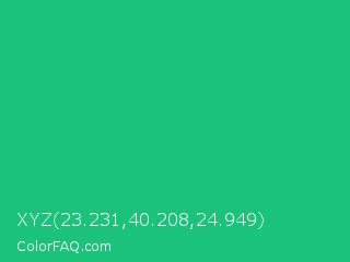 XYZ 23.231,40.208,24.949 Color is a normal green color and the nearest color is Mountain Meadow Crayola #1ab385. Hex code #1ac27a and RGB value is rgb(26,194,122). In RGB color space, this color is composed of 10% red, 76% green, 48% blue, In CMYK color space, this color is composed of 87% cyan, 0% magenta, 37% yellow , 24% black , In HSL color space, this color has a hue angle of 154° , 76% saturation and 43% lightness.