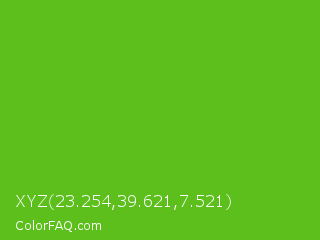XYZ 23.254,39.621,7.521 Color is a normal green color and the nearest color is Kelly Green #4cbb17. Hex code #5cbf1c and RGB value is rgb(92,191,28). In RGB color space, this color is composed of 36% red, 75% green, 11% blue, In CMYK color space, this color is composed of 52% cyan, 0% magenta, 85% yellow , 25% black , In HSL color space, this color has a hue angle of 96° , 74% saturation and 43% lightness.
