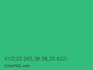 XYZ 23.265,38.58,25.622 Color is a normal green color and the nearest color is Medium Sea Green #3cb371. Hex code #33bd7d and RGB value is rgb(51,189,125). In RGB color space, this color is composed of 20% red, 74% green, 49% blue, In CMYK color space, this color is composed of 73% cyan, 0% magenta, 34% yellow , 26% black , In HSL color space, this color has a hue angle of 152° , 58% saturation and 47% lightness.