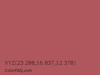 XYZ 23.288,16.837,12.378 Color is a normal red color and the nearest color is Matrix #b05d54. Hex code #b0575d and RGB value is rgb(176,87,93). In RGB color space, this color is composed of 69% red, 34% green, 36% blue, In CMYK color space, this color is composed of 0% cyan, 51% magenta, 47% yellow , 31% black , In HSL color space, this color has a hue angle of 356° , 36% saturation and 52% lightness.