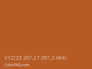 XYZ 23.297,17.397,3.964 Color is a normal orange color and the nearest color is Tuscany #bd5e2e. Hex code #b65a26 and RGB value is rgb(182,90,38). In RGB color space, this color is composed of 71% red, 35% green, 15% blue, In CMYK color space, this color is composed of 0% cyan, 51% magenta, 79% yellow , 29% black , In HSL color space, this color has a hue angle of 22° , 65% saturation and 43% lightness.