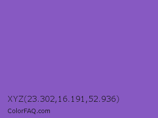 XYZ 23.302,16.191,52.936 Color is a normal violet color and the nearest color is Fuchsia Blue #7a58c1. Hex code #8759c2 and RGB value is rgb(135,89,194). In RGB color space, this color is composed of 53% red, 35% green, 76% blue, In CMYK color space, this color is composed of 30% cyan, 54% magenta, 0% yellow , 24% black , In HSL color space, this color has a hue angle of 266° , 46% saturation and 55% lightness.