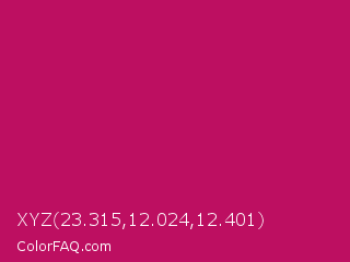 XYZ 23.315,12.024,12.401 Color is a normal rose color and the nearest color is Rose Red #c21e56. Hex code #bd0f61 and RGB value is rgb(189,15,97). In RGB color space, this color is composed of 74% red, 6% green, 38% blue, In CMYK color space, this color is composed of 0% cyan, 92% magenta, 49% yellow , 26% black , In HSL color space, this color has a hue angle of 332° , 85% saturation and 40% lightness.