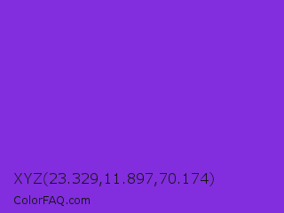 XYZ 23.329,11.897,70.174 Color is a normal violet color and the nearest color is Blue Violet #8a2be2. Hex code #822dde and RGB value is rgb(130,45,222). In RGB color space, this color is composed of 51% red, 18% green, 87% blue, In CMYK color space, this color is composed of 41% cyan, 80% magenta, 0% yellow , 13% black , In HSL color space, this color has a hue angle of 269° , 73% saturation and 52% lightness.