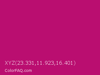 XYZ 23.331,11.923,16.401 Color is a normal magenta color and the nearest color is Lipstick #ab0563. Hex code #ba0e70 and RGB value is rgb(186,14,112). In RGB color space, this color is composed of 73% red, 5% green, 44% blue, In CMYK color space, this color is composed of 0% cyan, 92% magenta, 40% yellow , 27% black , In HSL color space, this color has a hue angle of 326° , 86% saturation and 39% lightness.