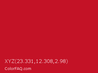 XYZ 23.331,12.308,2.98 Color is a normal red color and the nearest color is Lava #cf1020. Hex code #c41226 and RGB value is rgb(196,18,38). In RGB color space, this color is composed of 77% red, 7% green, 15% blue, In CMYK color space, this color is composed of 0% cyan, 91% magenta, 81% yellow , 23% black , In HSL color space, this color has a hue angle of 353° , 83% saturation and 42% lightness.