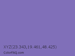 XYZ 23.343,19.461,48.425 Color is a normal indigo color and the nearest color is Middle Blue Purple #8b72be. Hex code #806fb9 and RGB value is rgb(128,111,185). In RGB color space, this color is composed of 50% red, 44% green, 73% blue, In CMYK color space, this color is composed of 31% cyan, 40% magenta, 0% yellow , 27% black , In HSL color space, this color has a hue angle of 254° , 35% saturation and 58% lightness.