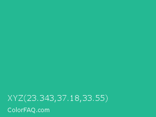 XYZ 23.343,37.18,33.55 Color is a normal cyan color and the nearest color is Mountain Meadow #30ba8f. Hex code #24b993 and RGB value is rgb(36,185,147). In RGB color space, this color is composed of 14% red, 73% green, 58% blue, In CMYK color space, this color is composed of 81% cyan, 0% magenta, 21% yellow , 27% black , In HSL color space, this color has a hue angle of 165° , 67% saturation and 43% lightness.