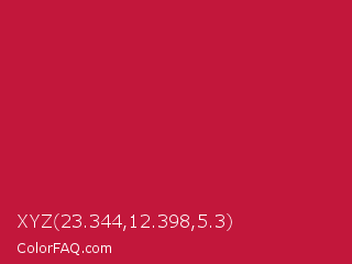 XYZ 23.344,12.398,5.3 Color is a normal red color and the nearest color is Cardinal #c41e3a. Hex code #c2173b and RGB value is rgb(194,23,59). In RGB color space, this color is composed of 76% red, 9% green, 23% blue, In CMYK color space, this color is composed of 0% cyan, 88% magenta, 70% yellow , 24% black , In HSL color space, this color has a hue angle of 347° , 79% saturation and 43% lightness.