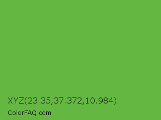 XYZ 23.35,37.372,10.984 Color is a normal green color and the nearest color is Green RYB #66b032. Hex code #64b841 and RGB value is rgb(100,184,65). In RGB color space, this color is composed of 39% red, 72% green, 25% blue, In CMYK color space, this color is composed of 46% cyan, 0% magenta, 65% yellow , 28% black , In HSL color space, this color has a hue angle of 102° , 48% saturation and 49% lightness.