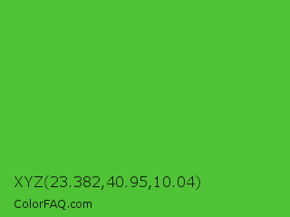 XYZ 23.382,40.95,10.04 Color is a normal green color and the nearest color is Apple #4fa83d. Hex code #4fc335 and RGB value is rgb(79,195,53). In RGB color space, this color is composed of 31% red, 76% green, 21% blue, In CMYK color space, this color is composed of 59% cyan, 0% magenta, 73% yellow , 24% black , In HSL color space, this color has a hue angle of 109° , 57% saturation and 49% lightness.