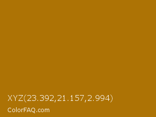 XYZ 23.392,21.157,2.994 Color is a normal orange color and the nearest color is Mai Tai #b06608. Hex code #ad7305 and RGB value is rgb(173,115,5). In RGB color space, this color is composed of 68% red, 45% green, 2% blue, In CMYK color space, this color is composed of 0% cyan, 34% magenta, 97% yellow , 32% black , In HSL color space, this color has a hue angle of 39° , 94% saturation and 35% lightness.