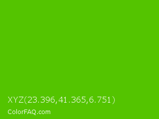XYZ 23.396,41.365,6.751 Color is a normal green color and the nearest color is Kelly Green #4cbb17. Hex code #54c400 and RGB value is rgb(84,196,0). In RGB color space, this color is composed of 33% red, 77% green, 0% blue, In CMYK color space, this color is composed of 57% cyan, 0% magenta, 100% yellow , 23% black , In HSL color space, this color has a hue angle of 94° , 100% saturation and 38% lightness.