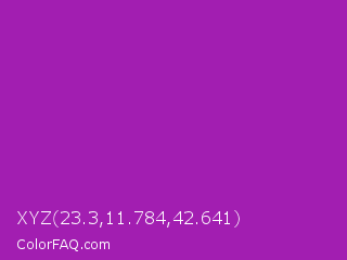 XYZ 23.3,11.784,42.641 Color is a normal magenta color and the nearest color is Violet Eggplant #991199. Hex code #a21eb1 and RGB value is rgb(162,30,177). In RGB color space, this color is composed of 64% red, 12% green, 69% blue, In CMYK color space, this color is composed of 8% cyan, 83% magenta, 0% yellow , 31% black , In HSL color space, this color has a hue angle of 294° , 71% saturation and 41% lightness.