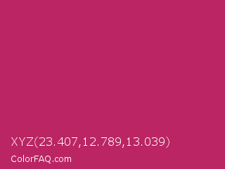 XYZ 23.407,12.789,13.039 Color is a normal rose color and the nearest color is Hibiscus #b6316c. Hex code #bb2563 and RGB value is rgb(187,37,99). In RGB color space, this color is composed of 73% red, 15% green, 39% blue, In CMYK color space, this color is composed of 0% cyan, 80% magenta, 47% yellow , 27% black , In HSL color space, this color has a hue angle of 335° , 67% saturation and 44% lightness.