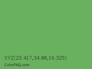 XYZ 23.417,34.88,16.325 Color is a normal green color and the nearest color is Fern #63b76c. Hex code #69b05f and RGB value is rgb(105,176,95). In RGB color space, this color is composed of 41% red, 69% green, 37% blue, In CMYK color space, this color is composed of 40% cyan, 0% magenta, 46% yellow , 31% black , In HSL color space, this color has a hue angle of 113° , 34% saturation and 53% lightness.