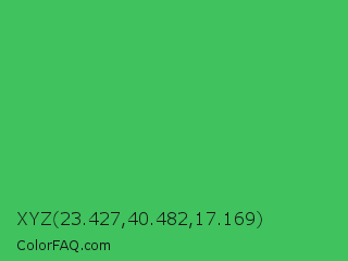 XYZ 23.427,40.482,17.169 Color is a normal green color and the nearest color is UFO Green #3cd070. Hex code #40c25e and RGB value is rgb(64,194,94). In RGB color space, this color is composed of 25% red, 76% green, 37% blue, In CMYK color space, this color is composed of 67% cyan, 0% magenta, 52% yellow , 24% black , In HSL color space, this color has a hue angle of 134° , 52% saturation and 51% lightness.
