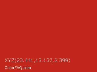 XYZ 23.441,13.137,2.399 Color is a normal red color and the nearest color is Thunderbird #c02b18. Hex code #c3271c and RGB value is rgb(195,39,28). In RGB color space, this color is composed of 76% red, 15% green, 11% blue, In CMYK color space, this color is composed of 0% cyan, 80% magenta, 86% yellow , 24% black , In HSL color space, this color has a hue angle of 4° , 75% saturation and 44% lightness.