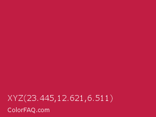 XYZ 23.445,12.621,6.511 Color is a normal red color and the nearest color is Maroon Flush #c32148. Hex code #c11d43 and RGB value is rgb(193,29,67). In RGB color space, this color is composed of 76% red, 11% green, 26% blue, In CMYK color space, this color is composed of 0% cyan, 85% magenta, 65% yellow , 24% black , In HSL color space, this color has a hue angle of 346° , 74% saturation and 44% lightness.