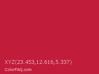 XYZ 23.453,12.616,5.337 Color is a normal red color and the nearest color is Cardinal #c41e3a. Hex code #c21c3b and RGB value is rgb(194,28,59). In RGB color space, this color is composed of 76% red, 11% green, 23% blue, In CMYK color space, this color is composed of 0% cyan, 86% magenta, 70% yellow , 24% black , In HSL color space, this color has a hue angle of 349° , 75% saturation and 44% lightness.
