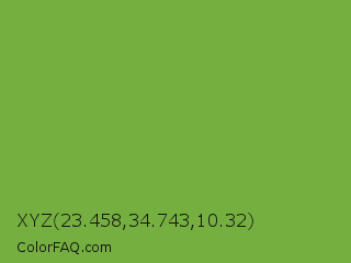XYZ 23.458,34.743,10.32 Color is a normal green color and the nearest color is Green RYB #66b032. Hex code #74af40 and RGB value is rgb(116,175,64). In RGB color space, this color is composed of 45% red, 69% green, 25% blue, In CMYK color space, this color is composed of 34% cyan, 0% magenta, 63% yellow , 31% black , In HSL color space, this color has a hue angle of 92° , 46% saturation and 47% lightness.