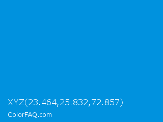 XYZ 23.464,25.832,72.857 Color is a normal blue color and the nearest color is Rich Electric Blue #0892d0. Hex code #0092de and RGB value is rgb(0,146,222). In RGB color space, this color is composed of 0% red, 57% green, 87% blue, In CMYK color space, this color is composed of 100% cyan, 34% magenta, 0% yellow , 13% black , In HSL color space, this color has a hue angle of 201° , 100% saturation and 44% lightness.