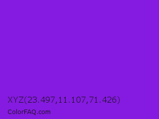 XYZ 23.497,11.107,71.426 Color is a normal purple color and the nearest color is Blue Violet #8a2be2. Hex code #851ae0 and RGB value is rgb(133,26,224). In RGB color space, this color is composed of 52% red, 10% green, 88% blue, In CMYK color space, this color is composed of 41% cyan, 88% magenta, 0% yellow , 12% black , In HSL color space, this color has a hue angle of 272° , 79% saturation and 49% lightness.
