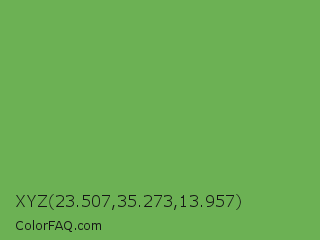 XYZ 23.507,35.273,13.957 Color is a normal green color and the nearest color is Bud Green #7bb661. Hex code #6cb154 and RGB value is rgb(108,177,84). In RGB color space, this color is composed of 42% red, 69% green, 33% blue, In CMYK color space, this color is composed of 39% cyan, 0% magenta, 53% yellow , 31% black , In HSL color space, this color has a hue angle of 105° , 37% saturation and 51% lightness.