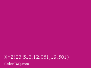 XYZ 23.513,12.061,19.501 Color is a normal magenta color and the nearest color is Red Violet #c71585. Hex code #b8137a and RGB value is rgb(184,19,122). In RGB color space, this color is composed of 72% red, 7% green, 48% blue, In CMYK color space, this color is composed of 0% cyan, 90% magenta, 34% yellow , 28% black , In HSL color space, this color has a hue angle of 323° , 81% saturation and 40% lightness.
