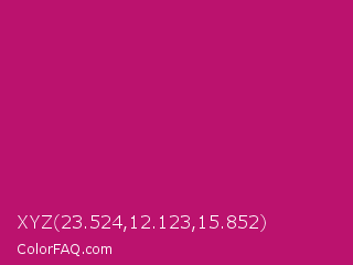 XYZ 23.524,12.123,15.852 Color is a normal magenta color and the nearest color is Lipstick #ab0563. Hex code #bb126e and RGB value is rgb(187,18,110). In RGB color space, this color is composed of 73% red, 7% green, 43% blue, In CMYK color space, this color is composed of 0% cyan, 90% magenta, 41% yellow , 27% black , In HSL color space, this color has a hue angle of 327° , 82% saturation and 40% lightness.