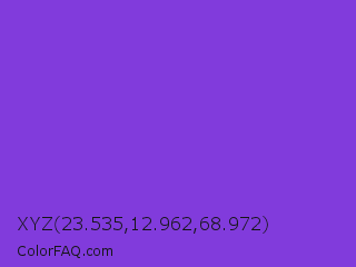 XYZ 23.535,12.962,68.972 Color is a normal violet color and the nearest color is Blue Violet #8a2be2. Hex code #813bdc and RGB value is rgb(129,59,220). In RGB color space, this color is composed of 51% red, 23% green, 86% blue, In CMYK color space, this color is composed of 41% cyan, 73% magenta, 0% yellow , 14% black , In HSL color space, this color has a hue angle of 266° , 70% saturation and 55% lightness.
