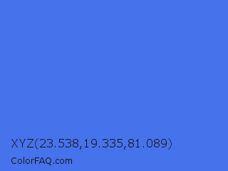 XYZ 23.538,19.335,81.089 Color is a normal blue color and the nearest color is Royal Blue #4169e1. Hex code #4672eb and RGB value is rgb(70,114,235). In RGB color space, this color is composed of 27% red, 45% green, 92% blue, In CMYK color space, this color is composed of 70% cyan, 51% magenta, 0% yellow , 8% black , In HSL color space, this color has a hue angle of 224° , 80% saturation and 60% lightness.
