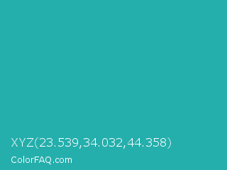 XYZ 23.539,34.032,44.358 Color is a normal cyan color and the nearest color is Light Sea Green #20b2aa. Hex code #25afac and RGB value is rgb(37,175,172). In RGB color space, this color is composed of 15% red, 69% green, 67% blue, In CMYK color space, this color is composed of 79% cyan, 0% magenta, 2% yellow , 31% black , In HSL color space, this color has a hue angle of 179° , 65% saturation and 42% lightness.