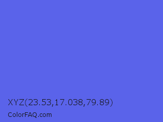 XYZ 23.53,17.038,79.89 Color is a light blue color and the nearest color is Majorelle Blue #6050dc. Hex code #5a63ea and RGB value is rgb(90,99,234). In RGB color space, this color is composed of 35% red, 39% green, 92% blue, In CMYK color space, this color is composed of 62% cyan, 58% magenta, 0% yellow , 8% black , In HSL color space, this color has a hue angle of 236° , 77% saturation and 64% lightness.