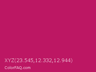 XYZ 23.545,12.332,12.944 Color is a normal rose color and the nearest color is Rose Red #c21e56. Hex code #bd1763 and RGB value is rgb(189,23,99). In RGB color space, this color is composed of 74% red, 9% green, 39% blue, In CMYK color space, this color is composed of 0% cyan, 88% magenta, 48% yellow , 26% black , In HSL color space, this color has a hue angle of 333° , 78% saturation and 42% lightness.