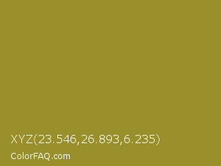 XYZ 23.546,26.893,6.235 Color is a normal yellow color and the nearest color is Luxor Gold #a7882c. Hex code #99902b and RGB value is rgb(153,144,43). In RGB color space, this color is composed of 60% red, 56% green, 17% blue, In CMYK color space, this color is composed of 0% cyan, 6% magenta, 72% yellow , 40% black , In HSL color space, this color has a hue angle of 55° , 56% saturation and 38% lightness.