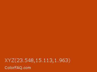 XYZ 23.548,15.113,1.963 Color is a normal orange color and the nearest color is Tia Maria #c1440e. Hex code #bf430a and RGB value is rgb(191,67,10). In RGB color space, this color is composed of 75% red, 26% green, 4% blue, In CMYK color space, this color is composed of 0% cyan, 65% magenta, 95% yellow , 25% black , In HSL color space, this color has a hue angle of 19° , 90% saturation and 39% lightness.