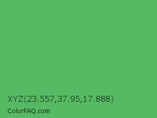 XYZ 23.557,37.95,17.888 Color is a normal green color and the nearest color is Fern #63b76c. Hex code #55ba63 and RGB value is rgb(85,186,99). In RGB color space, this color is composed of 33% red, 73% green, 39% blue, In CMYK color space, this color is composed of 54% cyan, 0% magenta, 47% yellow , 27% black , In HSL color space, this color has a hue angle of 128° , 42% saturation and 53% lightness.