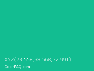 XYZ 23.558,38.568,32.991 Color is a normal cyan color and the nearest color is Mountain Meadow Crayola #1ab385. Hex code #12bd91 and RGB value is rgb(18,189,145). In RGB color space, this color is composed of 7% red, 74% green, 57% blue, In CMYK color space, this color is composed of 90% cyan, 0% magenta, 23% yellow , 26% black , In HSL color space, this color has a hue angle of 165° , 83% saturation and 41% lightness.