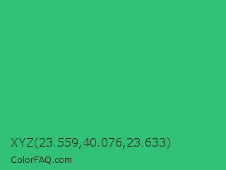 XYZ 23.559,40.076,23.633 Color is a normal green color and the nearest color is Medium Sea Green #3cb371. Hex code #30c176 and RGB value is rgb(48,193,118). In RGB color space, this color is composed of 19% red, 76% green, 46% blue, In CMYK color space, this color is composed of 75% cyan, 0% magenta, 39% yellow , 24% black , In HSL color space, this color has a hue angle of 149° , 60% saturation and 47% lightness.