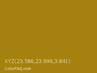 XYZ 23.586,23.999,3.841 Color is a normal yellow color and the nearest color is Dark Yellow #9b870c. Hex code #a5820f and RGB value is rgb(165,130,15). In RGB color space, this color is composed of 65% red, 51% green, 6% blue, In CMYK color space, this color is composed of 0% cyan, 21% magenta, 91% yellow , 35% black , In HSL color space, this color has a hue angle of 46° , 83% saturation and 35% lightness.