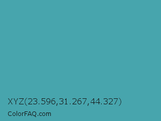 XYZ 23.596,31.267,44.327 Color is a normal cyan color and the nearest color is Verdigris #43b3ae. Hex code #47a5ad and RGB value is rgb(71,165,173). In RGB color space, this color is composed of 28% red, 65% green, 68% blue, In CMYK color space, this color is composed of 59% cyan, 5% magenta, 0% yellow , 32% black , In HSL color space, this color has a hue angle of 185° , 42% saturation and 48% lightness.
