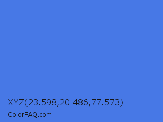 XYZ 23.598,20.486,77.573 Color is a normal blue color and the nearest color is Royal Blue #4169e1. Hex code #4778e6 and RGB value is rgb(71,120,230). In RGB color space, this color is composed of 28% red, 47% green, 90% blue, In CMYK color space, this color is composed of 69% cyan, 48% magenta, 0% yellow , 10% black , In HSL color space, this color has a hue angle of 222° , 76% saturation and 59% lightness.
