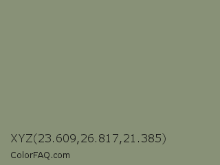 XYZ 23.609,26.817,21.385 Color is a normal green color and the nearest color is Battleship Gray #828f72. Hex code #889177 and RGB value is rgb(136,145,119). In RGB color space, this color is composed of 53% red, 57% green, 47% blue, In CMYK color space, this color is composed of 6% cyan, 0% magenta, 18% yellow , 43% black , In HSL color space, this color has a hue angle of 81° , 11% saturation and 52% lightness.