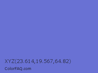 XYZ 23.614,19.567,64.82 Color is a light blue color and the nearest color is Blue Marguerite #7666c6. Hex code #6971d4 and RGB value is rgb(105,113,212). In RGB color space, this color is composed of 41% red, 44% green, 83% blue, In CMYK color space, this color is composed of 50% cyan, 47% magenta, 0% yellow , 17% black , In HSL color space, this color has a hue angle of 236° , 55% saturation and 62% lightness.